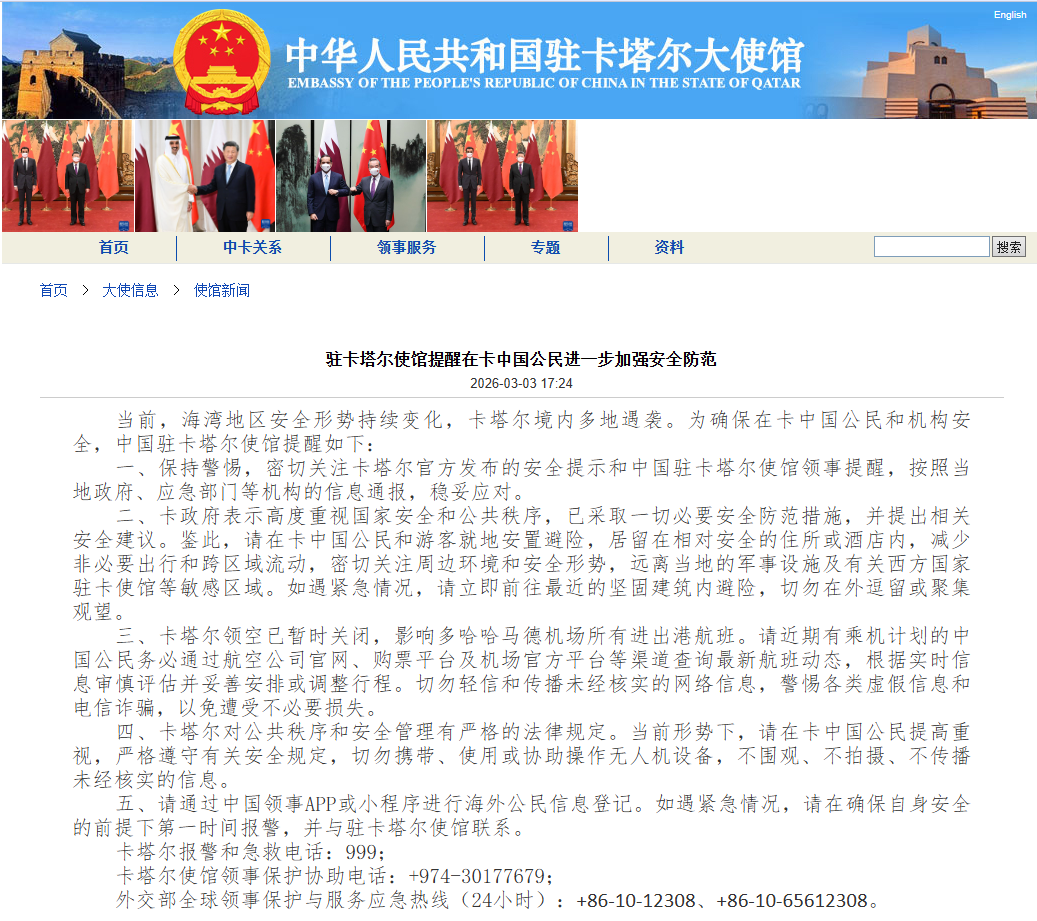 2026 年 3 月 3 日,中国驻卡塔尔使馆发布安全提醒,鉴于海湾地区安全形势变化、卡塔尔境内多地遇袭,提醒在卡中国公民加强防范。请密切关注官方提示,就地避险、减少非必要出行,远离军事设施及西方使馆等敏感区域。卡塔尔领空已临时关闭,机场航班受影响,需及时查询动态。同时严禁使用无人机,不传播未经核实信息,警惕电信诈骗。建议完成海外公民信息登记,紧急情况可拨打卡塔尔报警电话 999、使馆领保电话及外交部全球领保热线。