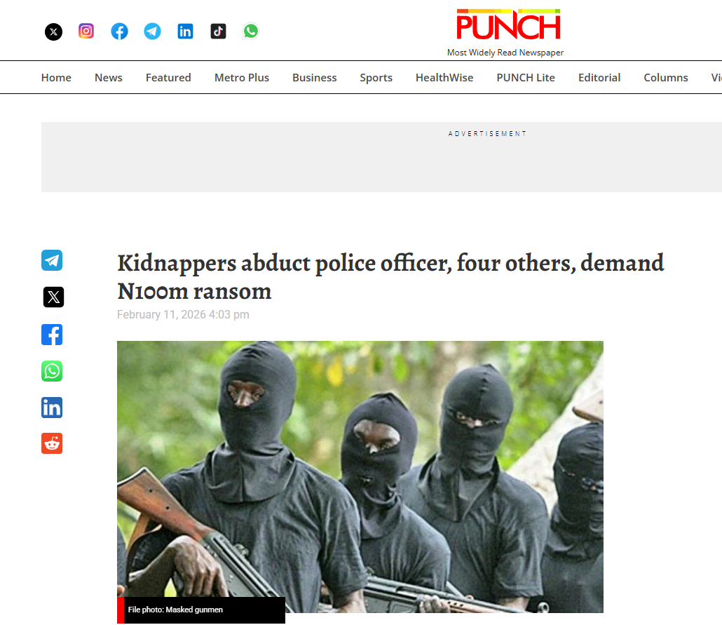 2 月 8 日,尼日利亚南部埃多州阿科科埃多地方政府区接连发生两起武装绑架事件,共造成 5 人被掳走,其中包括一名警察督察、其 16 岁女儿及一名 14 岁女中学生。据埃多州警方通报,绑匪在袭击后释放了警察的妻子,要求其筹集赎金,同时向人质家属明确索要 1 亿奈拉(约合 12.8 万美元)赎金。案发后,当地民众自发组织搜救队参与寻找,但未取得实质性进展,埃多州警方已成立专项工作组,通过路面设卡、排查嫌疑人活动轨迹等方式展开营救,目前已抓获 3 名涉案嫌疑人,正在追查其余绑匪及人质下落。