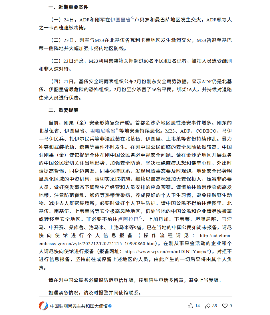当前刚安全形势复杂严峻,金沙萨恶性治安案件增多,刚东多省遭多股非法武装侵扰,中国公民安全风险高。使馆提醒,严禁前往伊图里等 4 个极高风险省,非必要不前往卢阿拉巴等 9 省,滞留高风险区人员尽快撤离;中资机构强化安保、制定预案,公民做好热带传染病防范,未报备者尽快通过 “中国领事” APP 或采金专属系统完成报备,警惕电信诈骗。